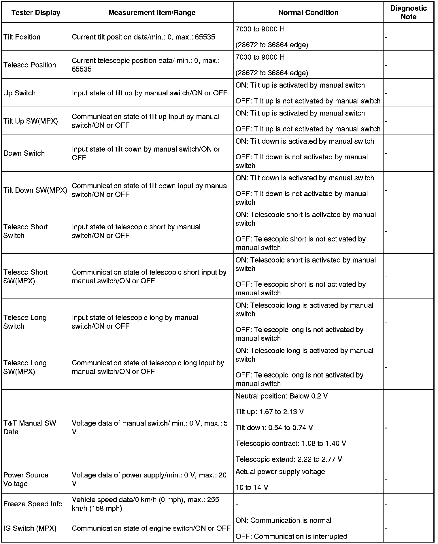 (d) Check the freeze frame data. Enter the following menus: Chassis / Tilt&Telescopic / Utility / Freeze Frame Data.