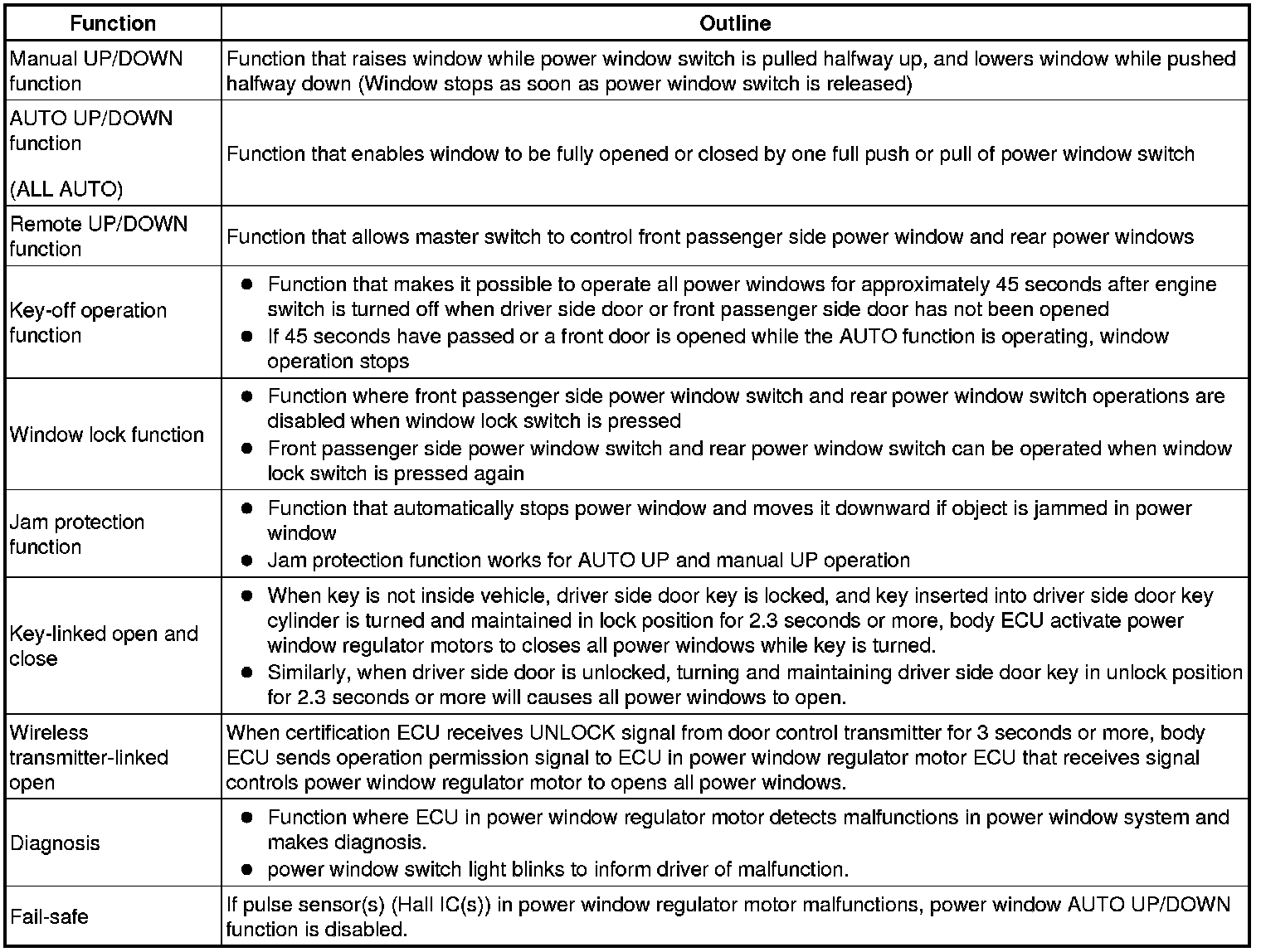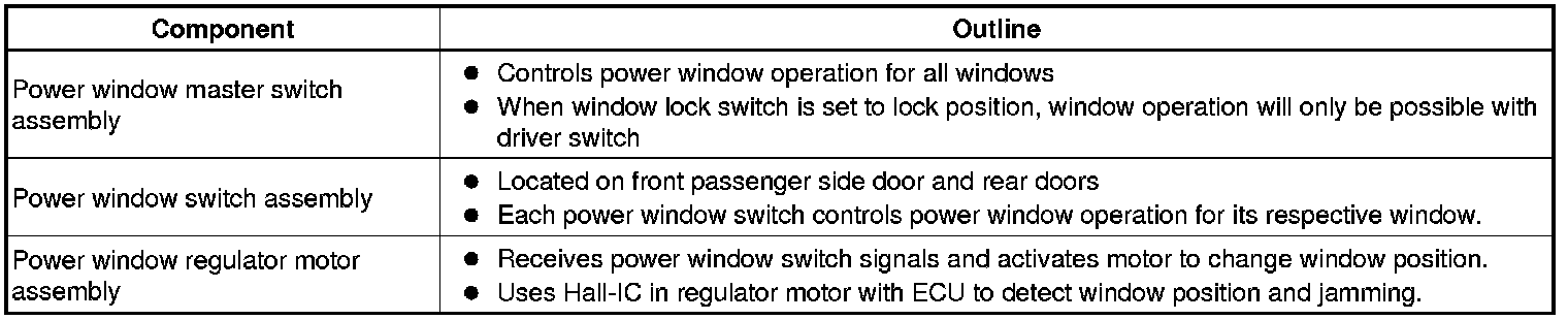 - Pressing either of the power window switches on the power window switches or either of the power window switches on the master switch transmits an UP/DOWN signal to the corresponding power window regulator motor assembly.