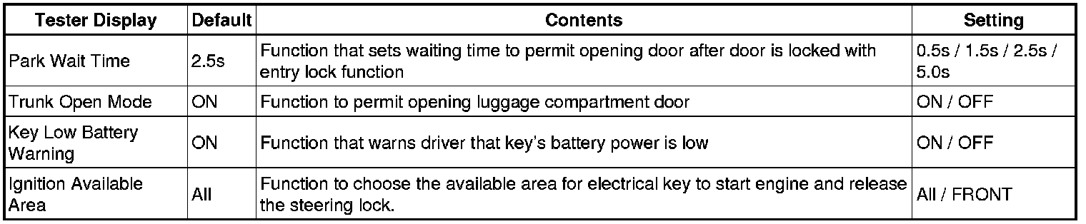 The function only changes the entry unlock mode of the smart access system with push-button start. It does not switch the unlocking of the wireless door lock control.