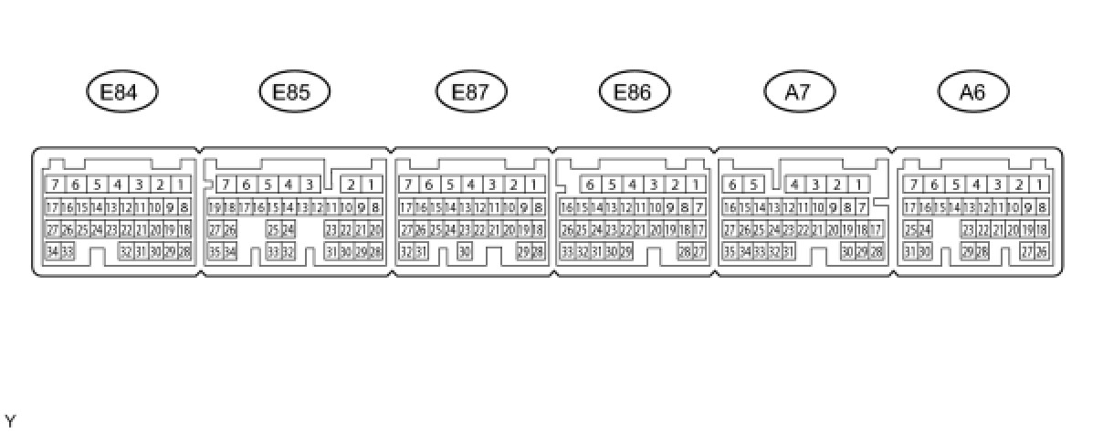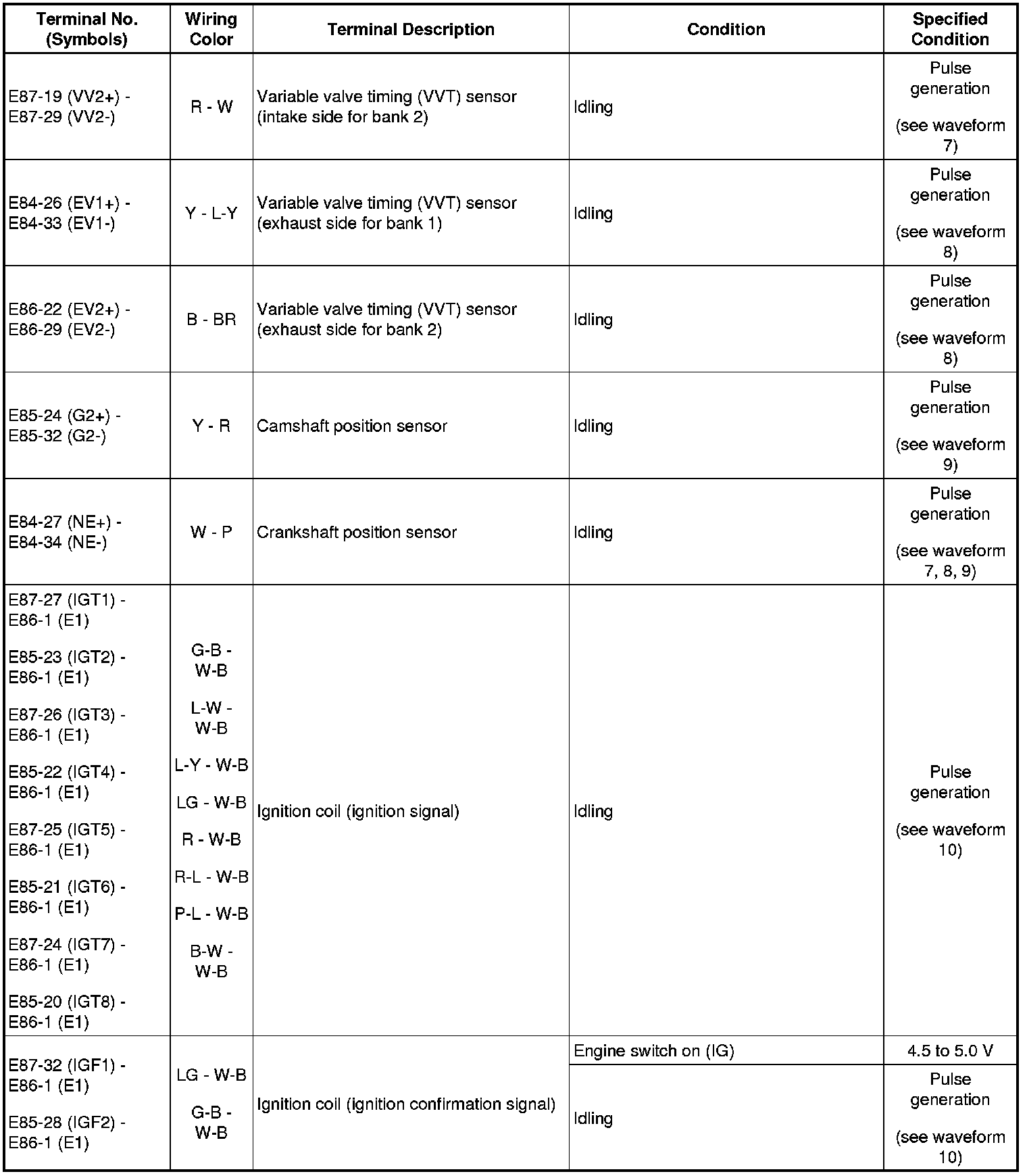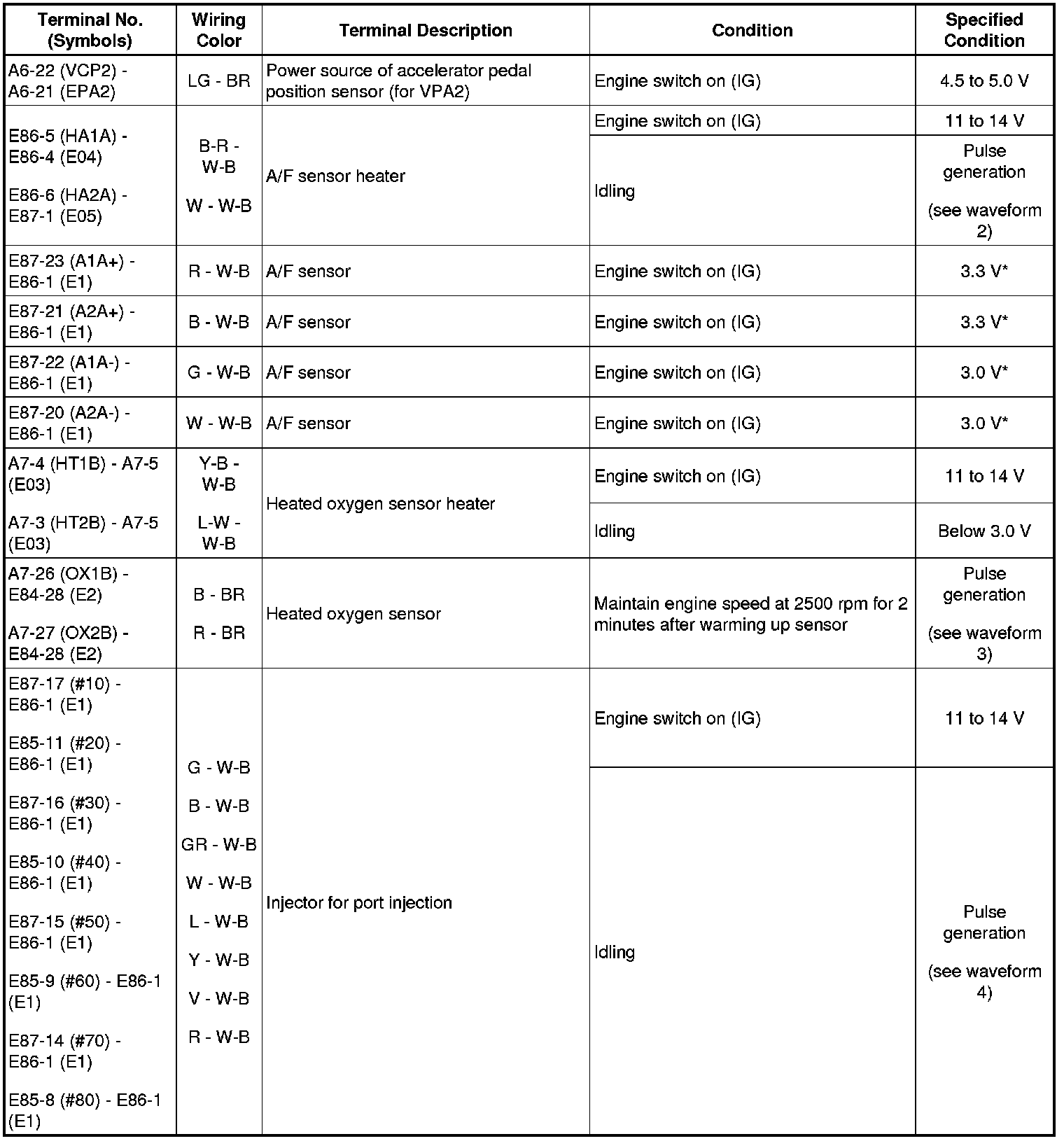 The standard normal voltage between each pair of the ECM terminals is shown in the table below. The appropriate conditions for checking each pair of the terminals are also indicated. The result of checks should be compared with the standard normal voltage for that pair of terminals, displayed in the Specified Condition column. The illustration above can be used as a reference to identify the ECM terminal locations.