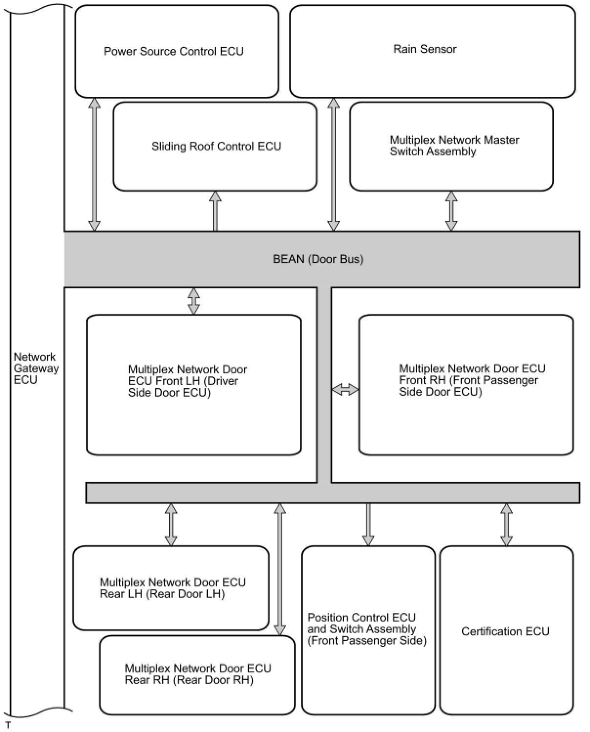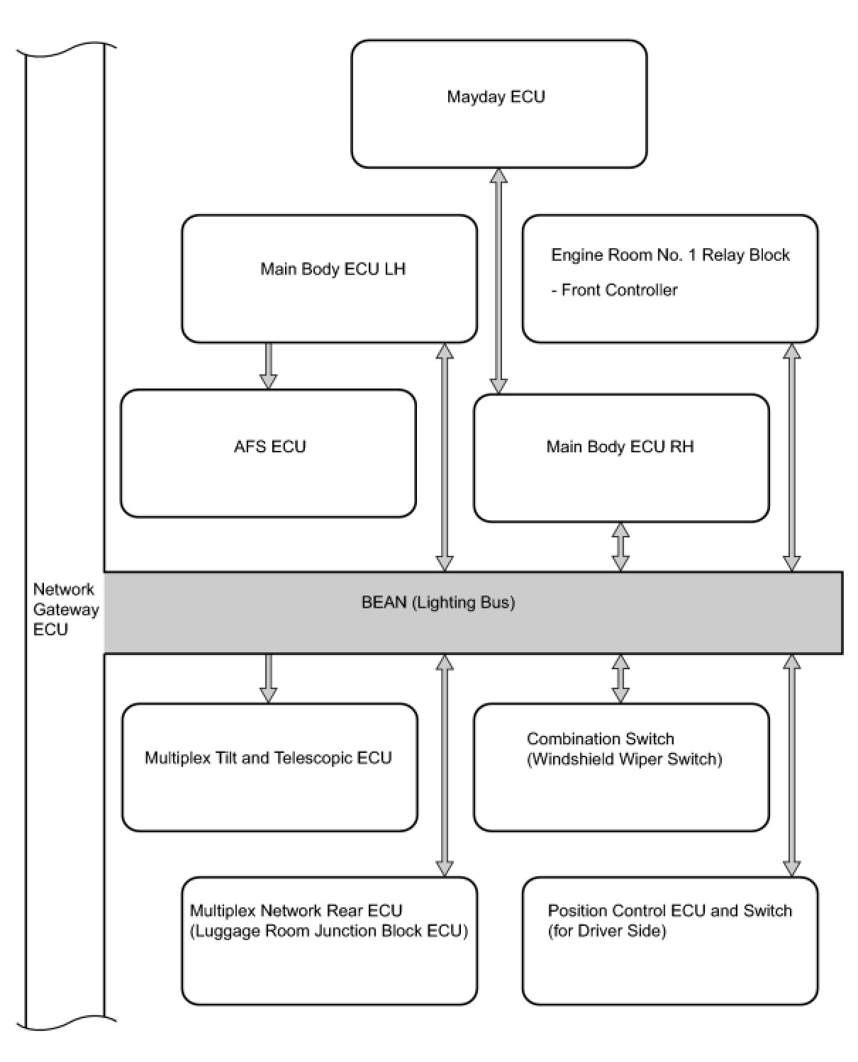 (1) The BEAN uses a ring and bus style of network to connect ECUs. This style of communication method is called a daisy chain. In a daisy chain, communication can be maintained even if the network has an open circuit.