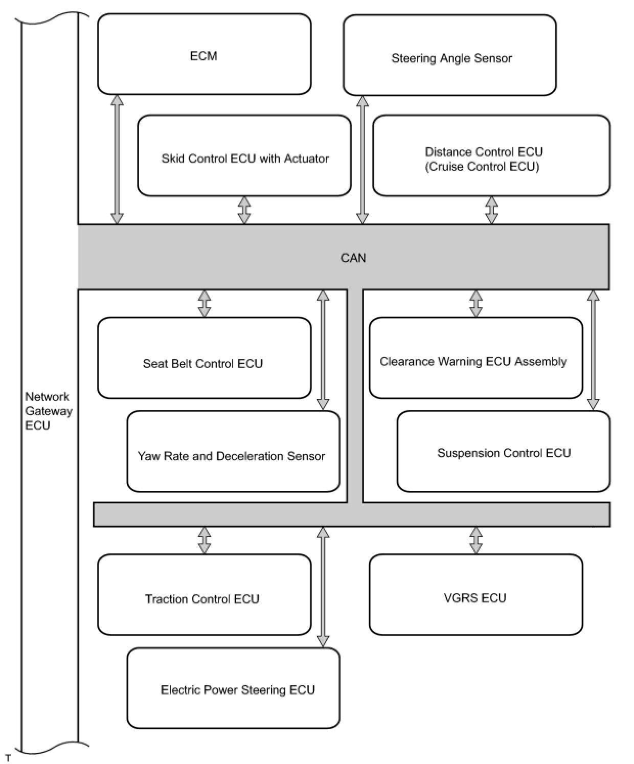 (2) CAN communication uses the bus style network to connect ECUs. This network consists of a main bus line (comprising junction connectors and a sub bus line (comprising ECUs that are connected to the main bus line). This style enables communication among all the connected ECUs.