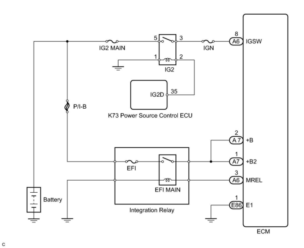 When the engine switch is turned on (IG), voltage from the ECM's MREL terminal is applied to the EFI MAIN relay. This causes the contacts of the EFI MAIN relay to close, which supplies power to terminal +B and +B2 of the ECM.