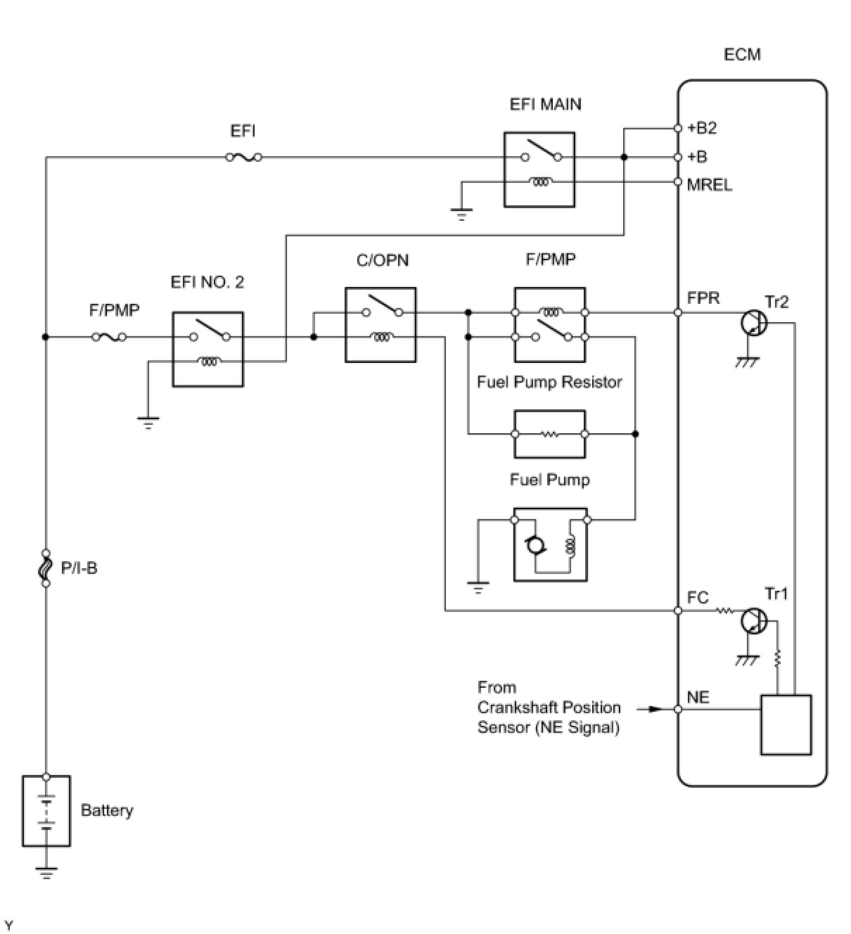 When the engine is cranked, a signal is sent from the main body ECU's STSW terminal to the ECM's STSW terminal. Then voltage travels from the ECM's STAR terminal through the park/neutral position switch to the ST relay coil. The STAR terminal also sends a signal to the STA terminal. When the STA signal and NE signal are input to the ECM, the ECM interior's Tr1 turns ON, which causes power to be supplied to the C/OPN relay coil (C/OPN ON). As a result, the F/PMP relay actuates, which causes the fuel pump to operate. If the engine is operating and NE signals are being output, the ECM interior's Tr1 is ON (C/OPN ON), and the fuel pump will continue operating. The fuel pump has a high and low speed setting. When the engine is starting or operating with a heavy load, the ECM interior's Tr2 turns ON to actuate the F/PMP relay so that the fuel pump operates at the high speed setting. When the engine is idling or operating with a light load, the Tr2 turns OFF, and current flows through the fuel pump resistor to the fuel pump so that the fuel pump operates at the low speed setting.