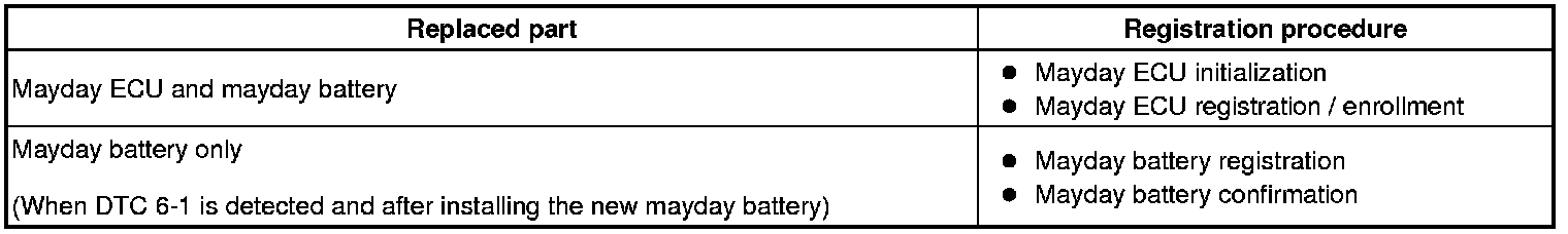 If the "MAYDAY BATTERY REGISTRATION BUTTON SEQUENCE" has not been completed correctly, current DTC 6-1 will continue to be detected even if the mayday battery is replaced with a new one. In this case, check to be sure the old battery is removed and the new battery is installed. Then perform the "MAYDAY BATTERY REGISTRATION BUTTON SEQUENCE" again.