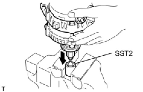 With SST2 (pulley nut) secured in place, the pulley lock nut will loosen due to the rotation of SST1-A in the direction shown in the illustration.