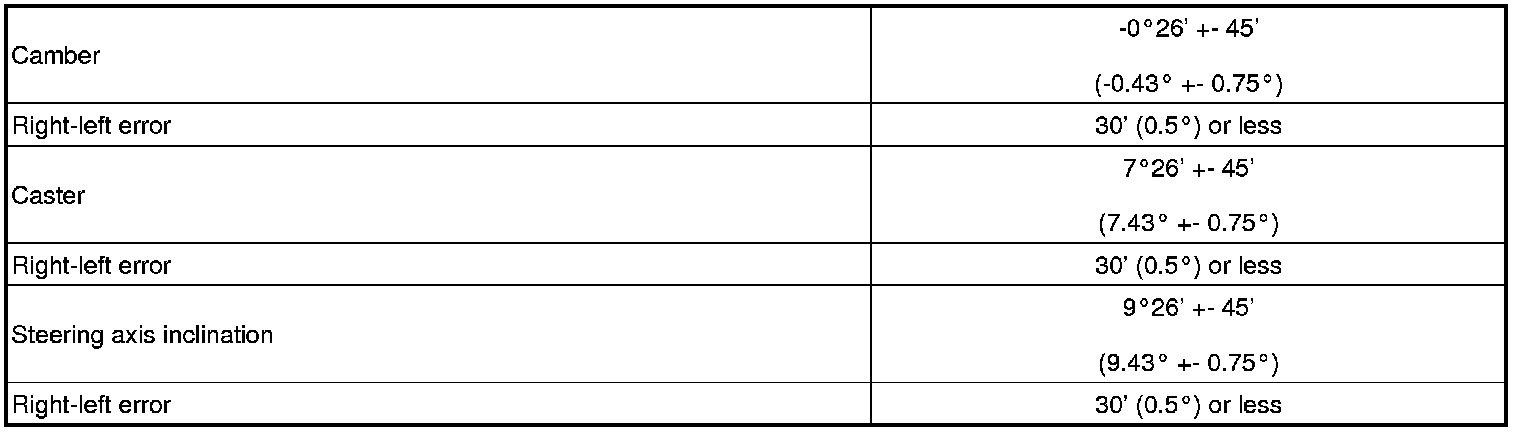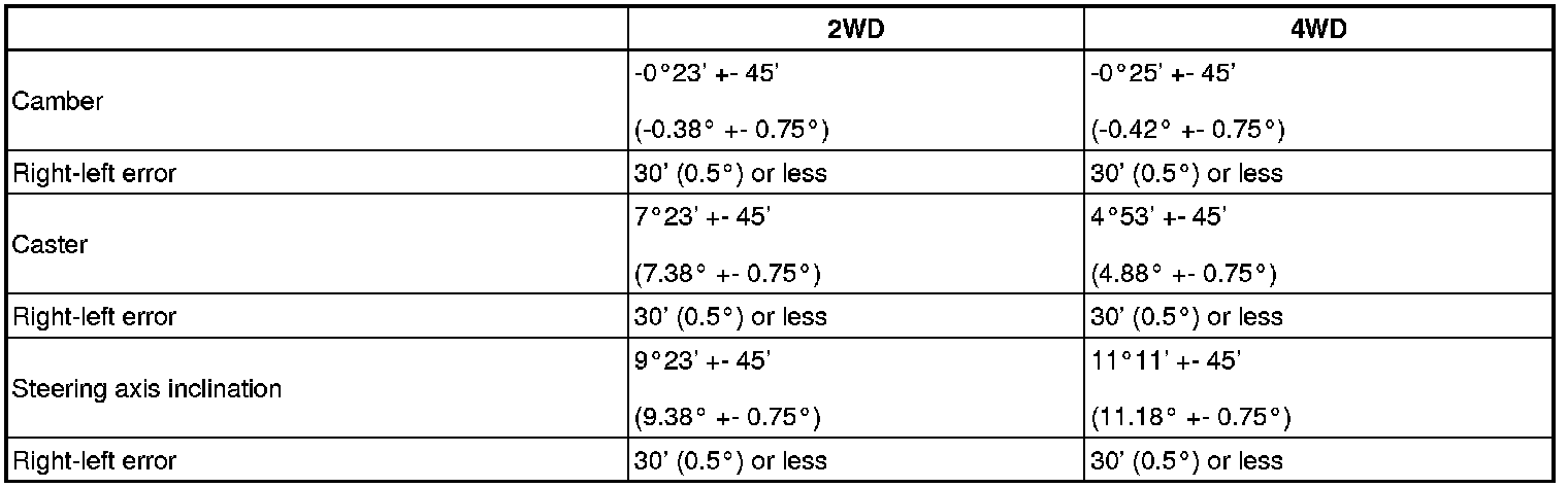 - The maximum tolerance of right and left difference for the camber and caster is 30' (0.5°) or less.