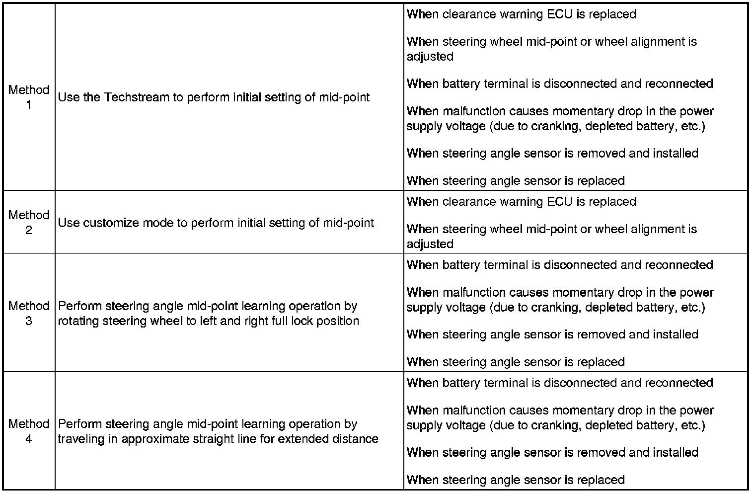 The mid-point learning operation (steering angle mid-point, maximum steering angle) can be performed using 4 methods: