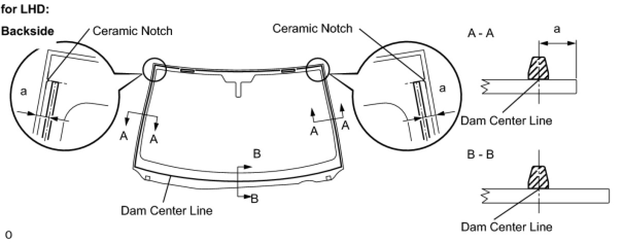(b) Remove the peeling paper from the adhesive part of the dam. Install the dam (adhesive side) to the glass (Primer G area), but exclude the area above the notches on the upper part of the glass.