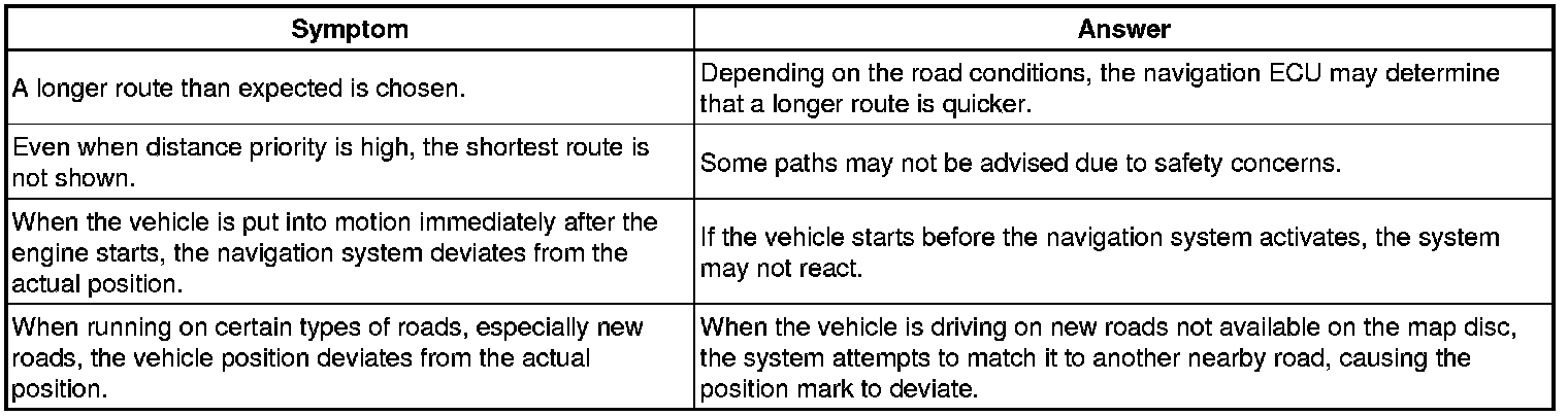 (b) The following symptoms are not a malfunction, but are caused by errors inherent in the GPS, gyro sensor, speed sensor, and navigation ECU.