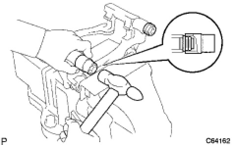 (c) Using a socket wrench (21 mm) and a hammer, install the 2 bushing dust boots.