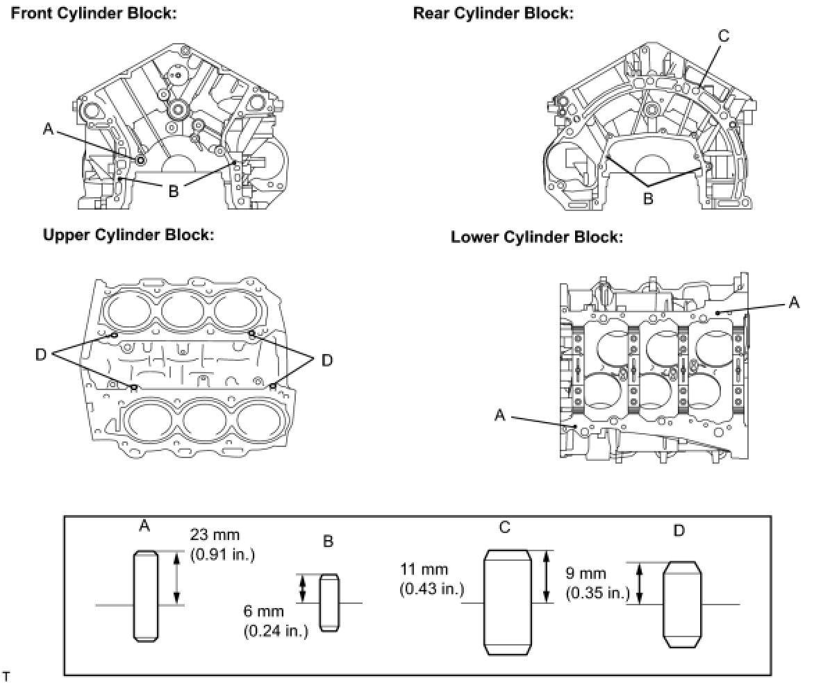 NOTE: Main bearings come in widths between 18.0 mm (0.709 in.) and 21.0 mm (0.827 in.). Install the 21.0 mm (0.827 in.) bearings in the No. 1 and No. 4 cylinder block journal positions with the main bearing cap. Install the 18.0 mm (0.709 in.) bearings in the No. 2 and No. 3 positions.