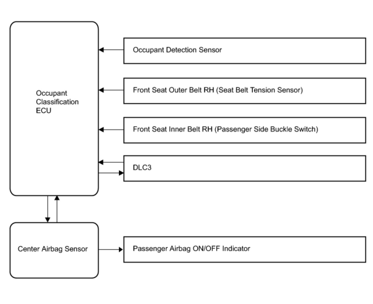 (b) This system is mainly composed of the occupant detection sensor that detects the load on the front passenger seat. The occupant classification ECU controls the system, and the passenger airbag ON/OFF indicator indicates the ON/OFF condition of the front passenger airbag and front passenger side - side airbag.
