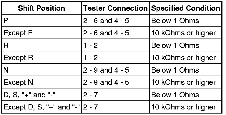 If the resistance value is not as specified, replace the park/neutral position switch assembly.
