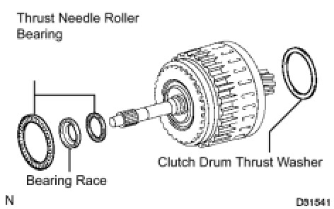(b) Remove the clutch drum thrust washer, 2 thrust needle roller bearings and bearing race.