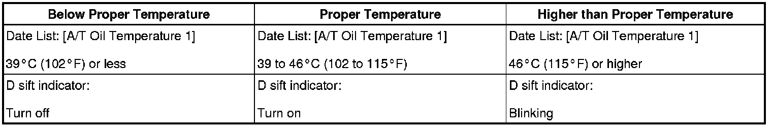 NOTE: The fluid temperature can be confirmed by checking the D shift indicator in the meter or by Techstream. It is necessary to change to fluid temperature detection mode.