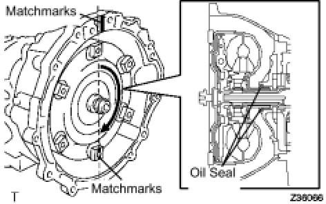 (d) Turn the torque converter and align the matchmarks on the torque converter and transmission case to engage the key of the oil pump drive gear into the slot on the torque converter.