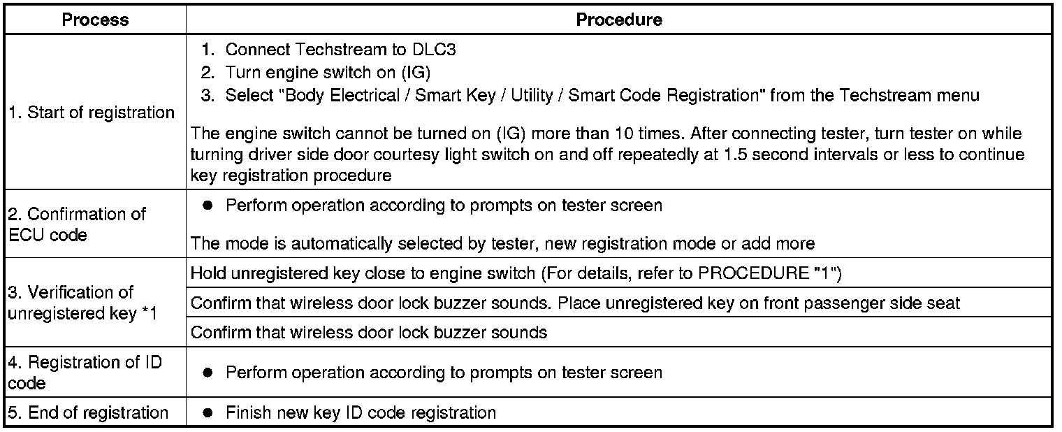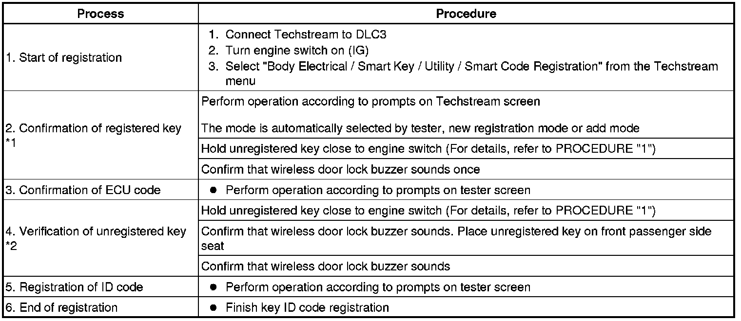 - *1: Perform this process for one of the keys registered for the vehicle. Finish the procedure within 30 seconds. If the procedure has not been finished within the specified time, perform registration procedures from process 1 again.