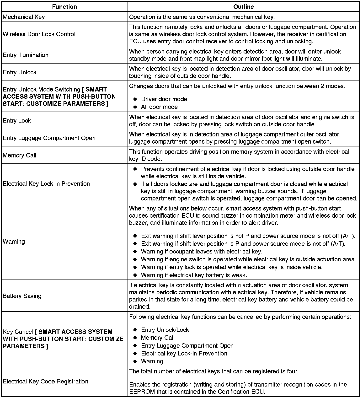 (a) In addition to conventional mechanical key and wireless door lock control functions, the entry and start system enables door locking/unlocking, steering lock releasing, engine starting and luggage compartment door opening without operating the electrical key. The only requirement is that the electrical key is in the user's possession.