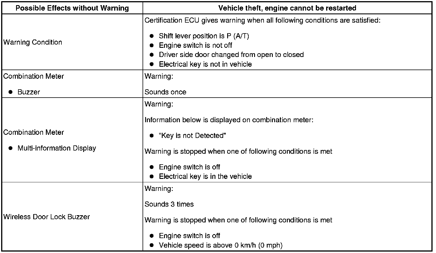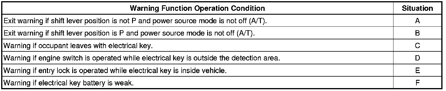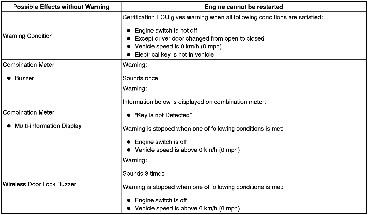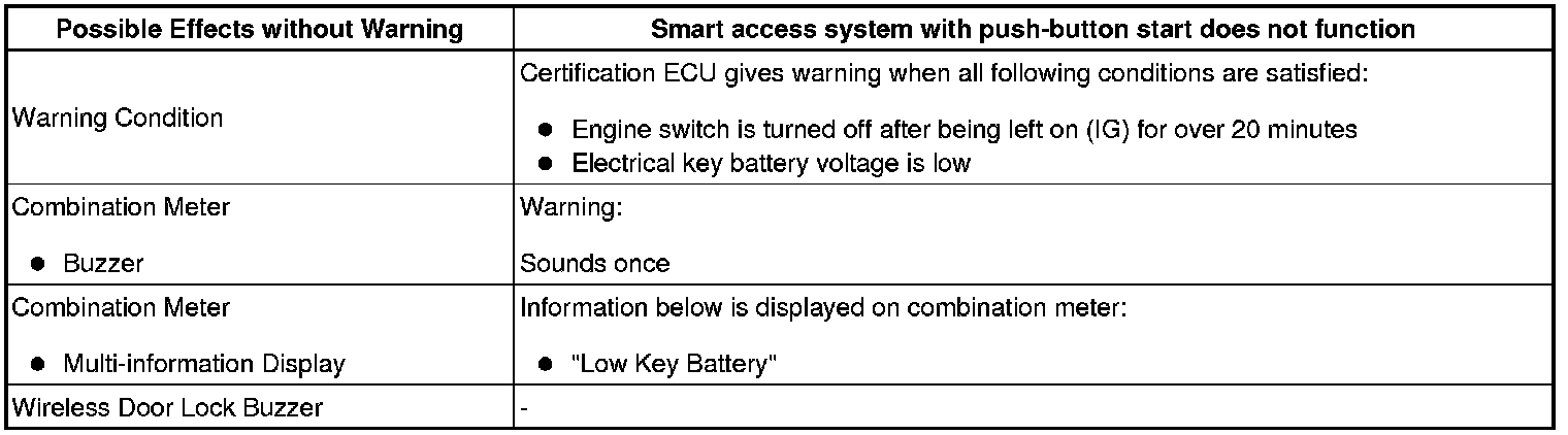 When any of the situations below occur, the smart access system with push-button start causes the certification ECU to sound the buzzer in the combination meter and the wireless door lock buzzer, and illuminate the combination meter's multi-information display in order to alert the driver.