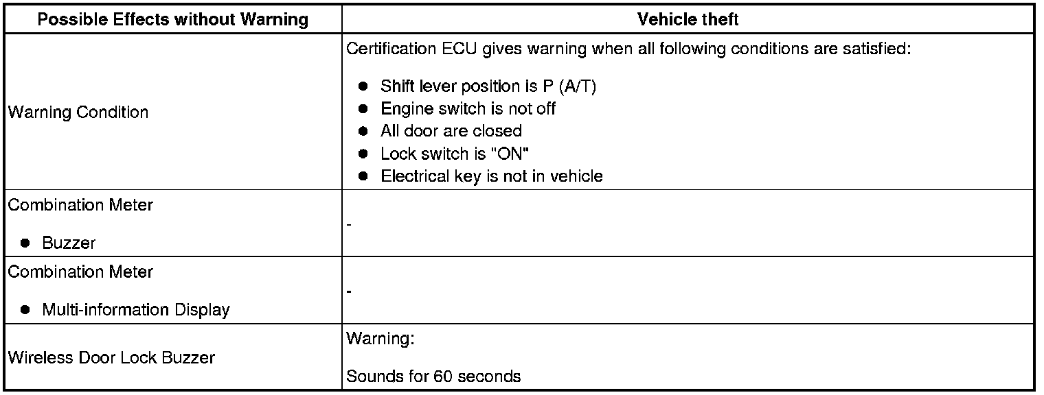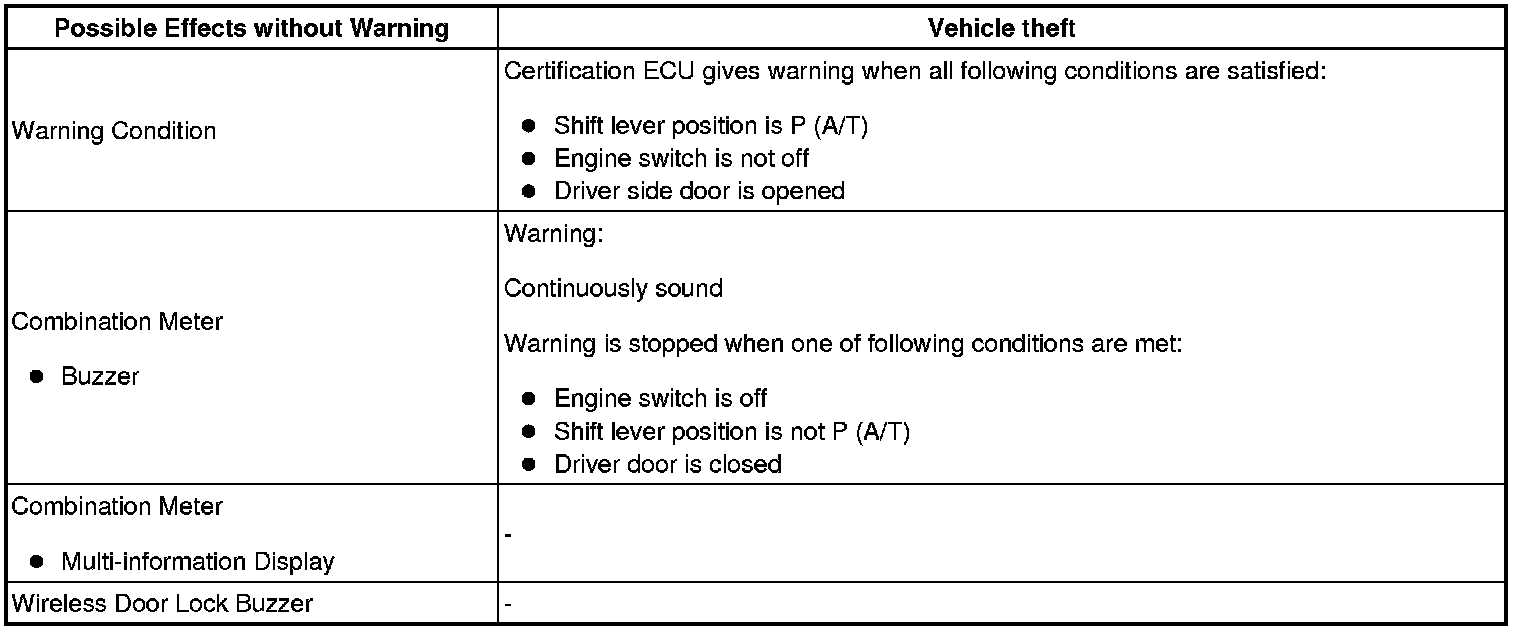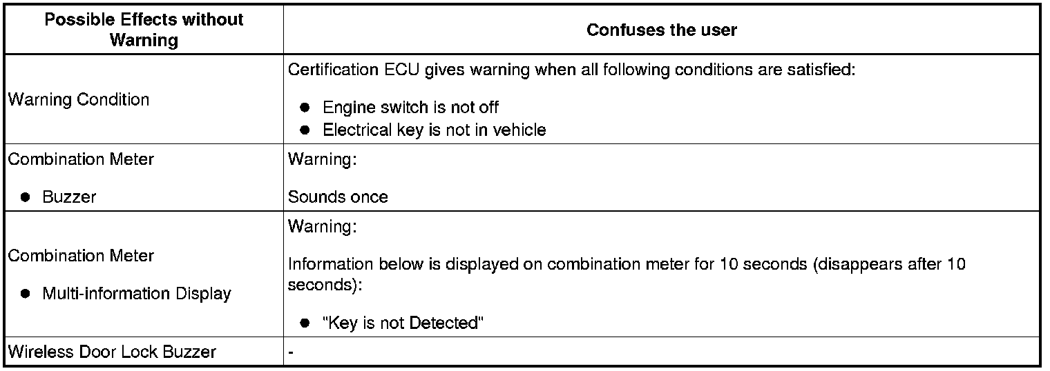 When any of the situations below occur, the smart access system with push-button start causes the certification ECU to sound the buzzer in the combination meter and the wireless door lock buzzer, and illuminate the combination meter's multi-information display in order to alert the driver.