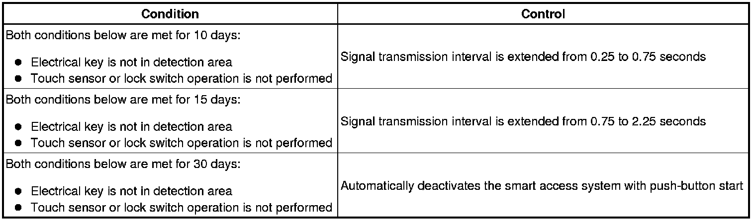 In the smart access system with push-button start, signals are emitted outside of the vehicle at a prescribed interval (0.25 seconds) when the doors are locked. Therefore, the vehicle battery could be drained if the vehicle remains parked for a long time. For this reason, the controls listed below are affected:
