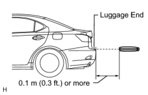 (3) Inspect the electrical key lock-in prevention's detection area and the entry door control receiver for wave leaks. Hold the electrical key at the same height as the lower edge of the luggage compartment door and aligned with the center of the rear of the vehicle. Pay attention to the direction and position of the electrical key shown in the illustration. When the electrical key is over 0.1 m (0.3 ft) from the vehicle's rear bumper, check that the electrical key's wireless buzzer does not sound.