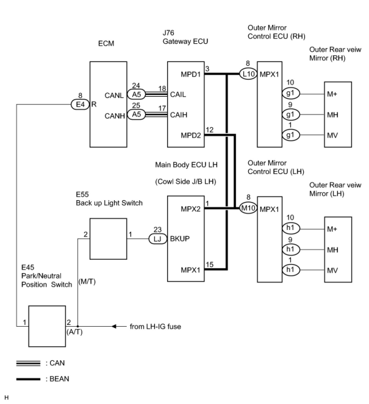 After the ECM receives a reverse signal from the park/neutral position switch, the ECM sends a reverse signal to the outer mirror control ECU via the CAN and BEAN communication systems. The outer mirror control ECU activates the mirror motor in response to the reverse signal.
