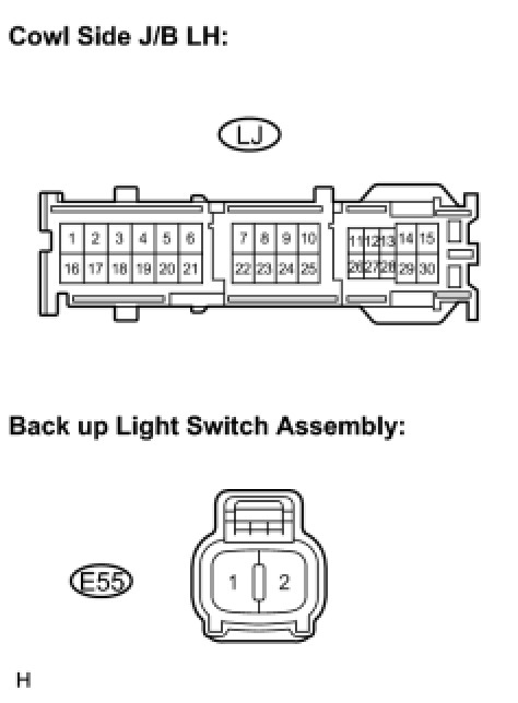 5. CHECK WIRE HARNESS (BACK UP LIGHT SWITCH ASSEMBLY - COWL SIDE J/B LH)
