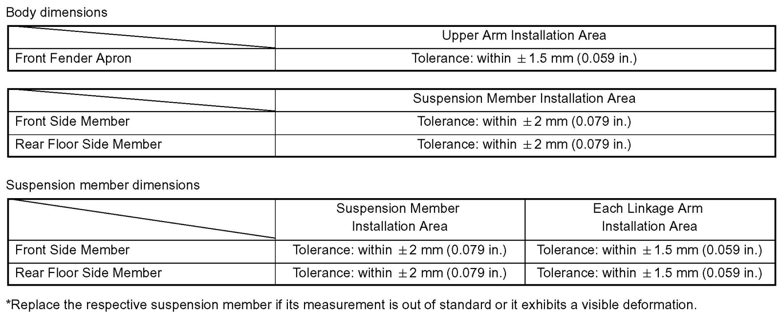 1. It is not possible to adjust the camber during a repair or replacement of the front fender apron, front side member, or rear floor side member parts. Therefore, the link arms and the front and rear suspension members must be mounted with a high level of accuracy.
