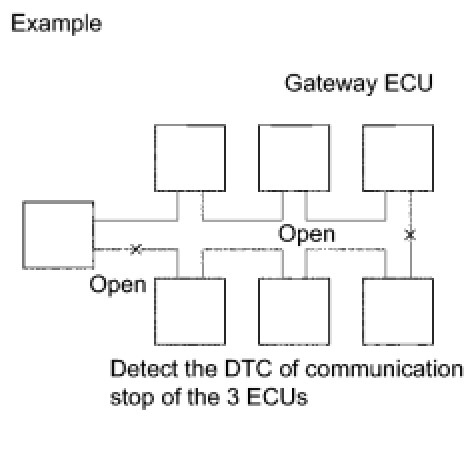 (4) If 2 communication buses are open at the position as shown in the illustration, DTC of ECU communication stop between those 2 buses is output.