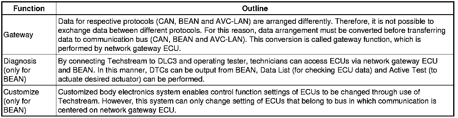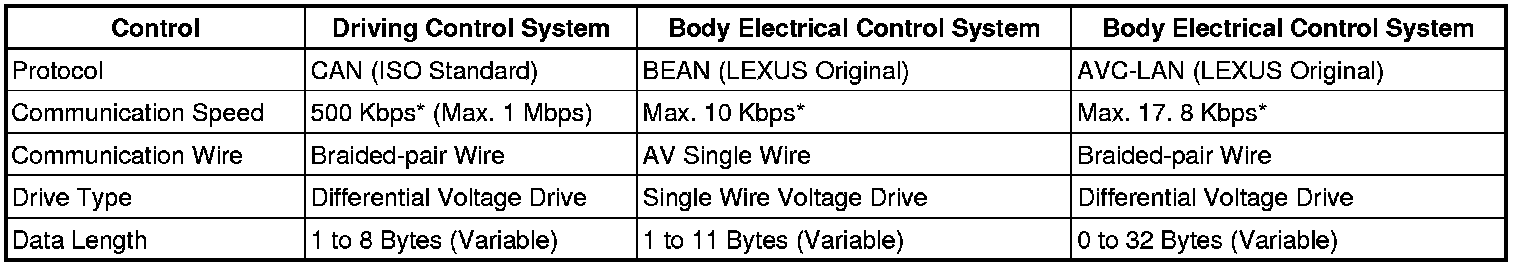 (1) The CAN, BEAN and AVC-LAN protocols have set guidelines for data. The guidelines include communication speed, type of communication wire, drive type and data length. These guidelines are established to facilitate ECU data communication.