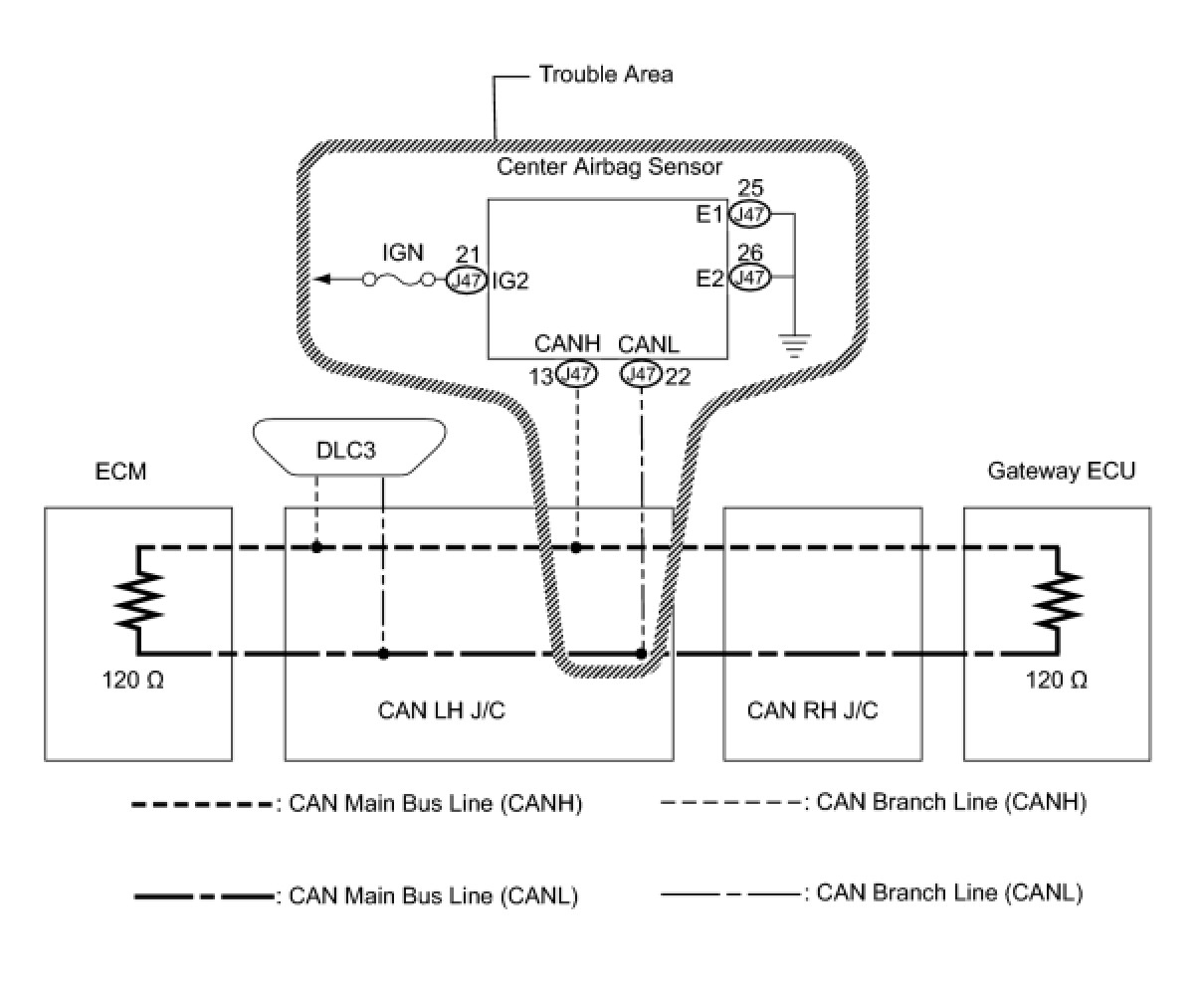 NG -- REPAIR OR REPLACE CENTER AIRBAG SENSOR BRANCH WIRE OR CONNECTOR (CANH, CANL)