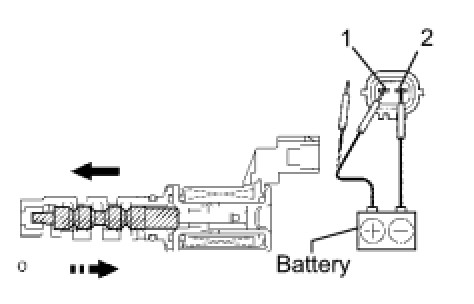 (b) Connect the battery's positive (+) lead to terminal 1 and negative (-) lead to terminal 2, and check the movement of the valve.