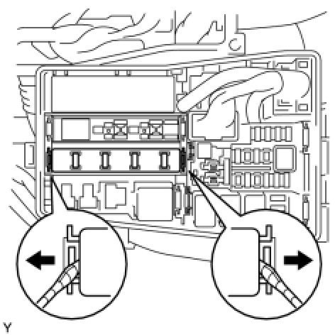 (b) Using a screwdriver, detach the 2 claws and disconnect the integration relay from the engine room No. 2 relay block.