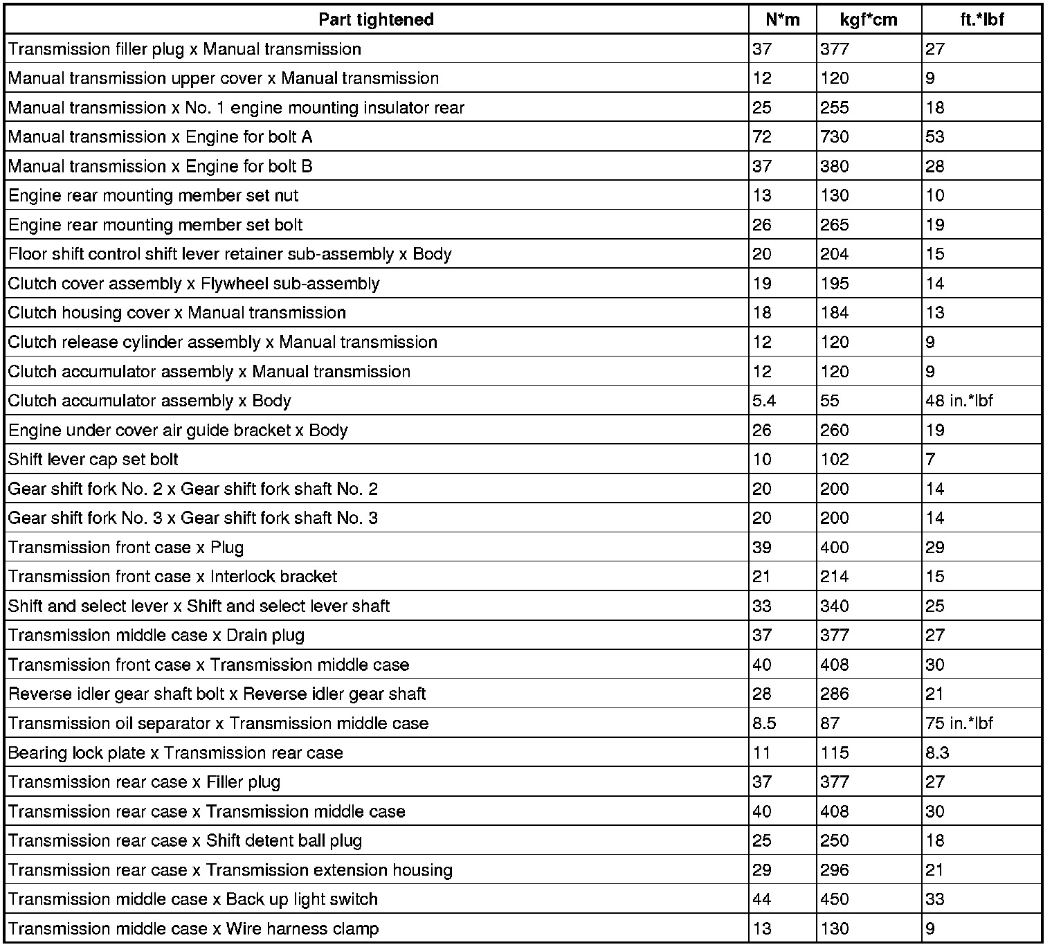 SERVICE SPECIFICATIONS: RA62 MANUAL TRANSMISSION: TORQUE SPECIFICATIONS