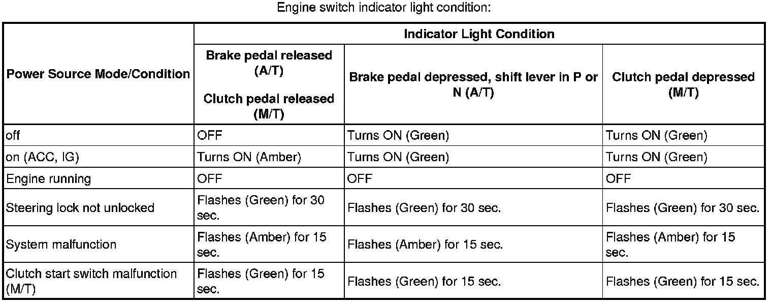 (h) After the buzzer sounds, if the engine switch is pressed within 5 seconds with the brake pedal not depressed (A/T) or clutch pedal not depressed (M/T), the power source mode changes to on (ACC) or on (IG), the same as in the normal condition.
