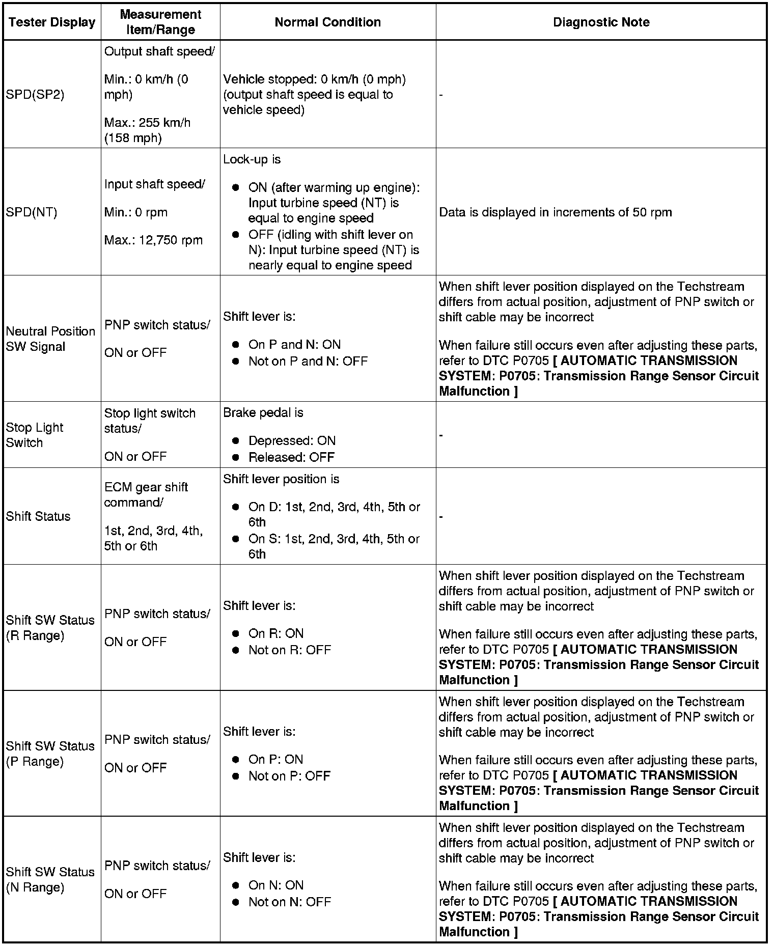HINT: Using the Techstream to read the Data List allows the values or states of switches, sensors, actuators and other items to be read without removing any parts. This non-intrusive inspection can be very useful because intermittent conditions or signals may be discovered before parts or wiring is disturbed. Reading the Data List information early in troubleshooting is one way to save diagnostic time.