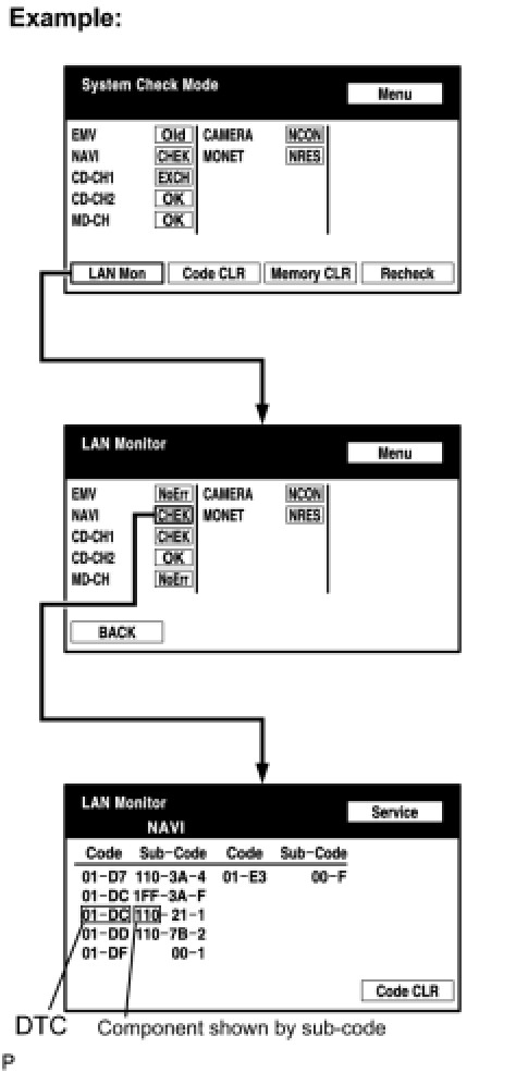 (2) Check for an open or short in the AVC-LAN circuit between the multi-display and the component shown by the sub-code.