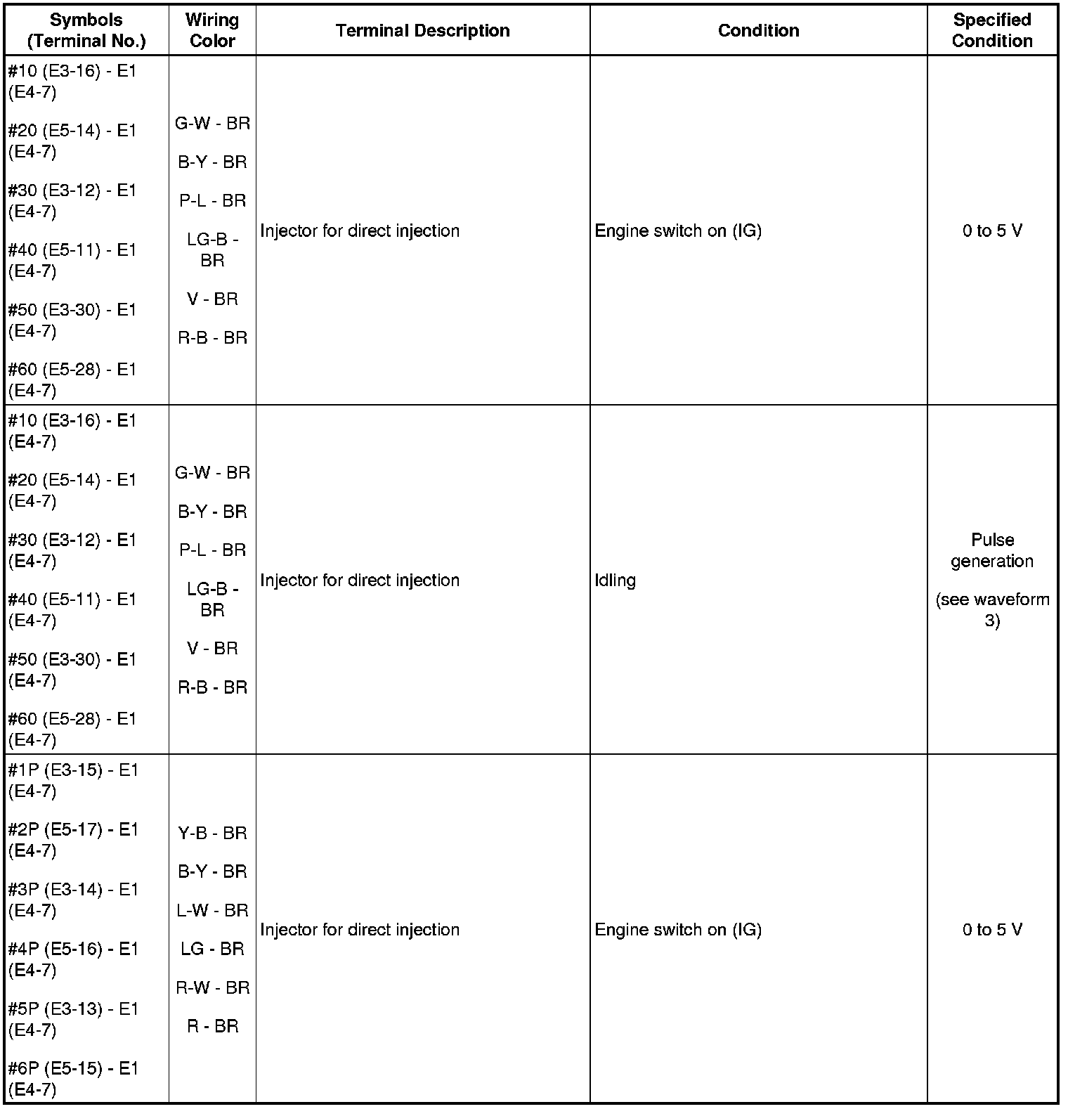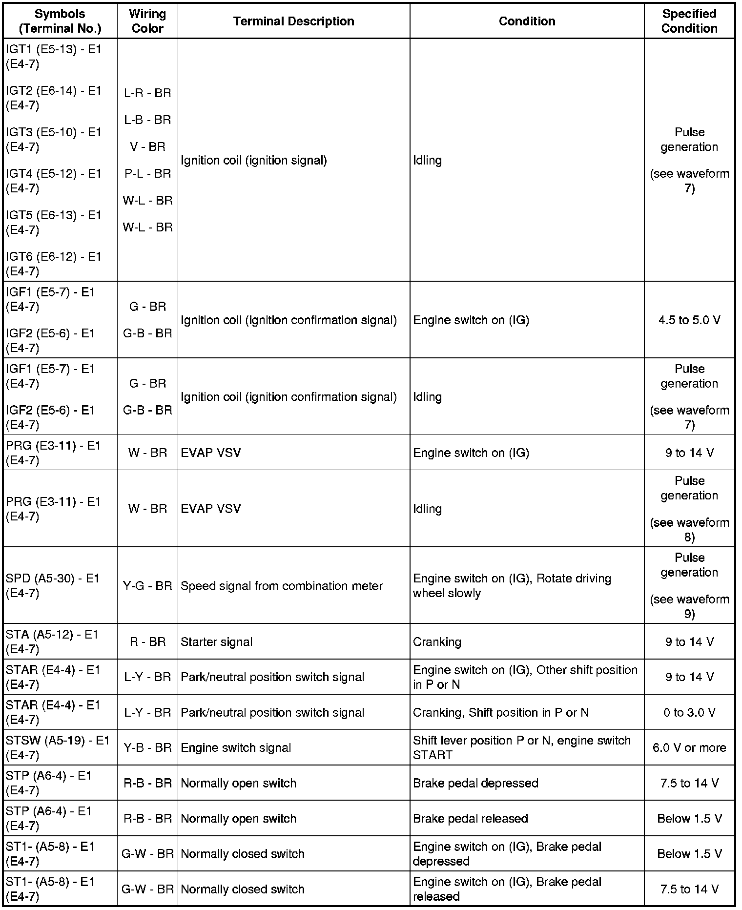 HINT: The standard normal voltage between each pair of the ECM terminals is shown in the table below. The appropriate conditions for checking each pair of the terminals are also indicated. The result of checks should be compared with the standard normal voltage for that pair of terminals, displayed in the Specified Condition column. The illustration above can be used as a reference to identify the ECM terminal locations.