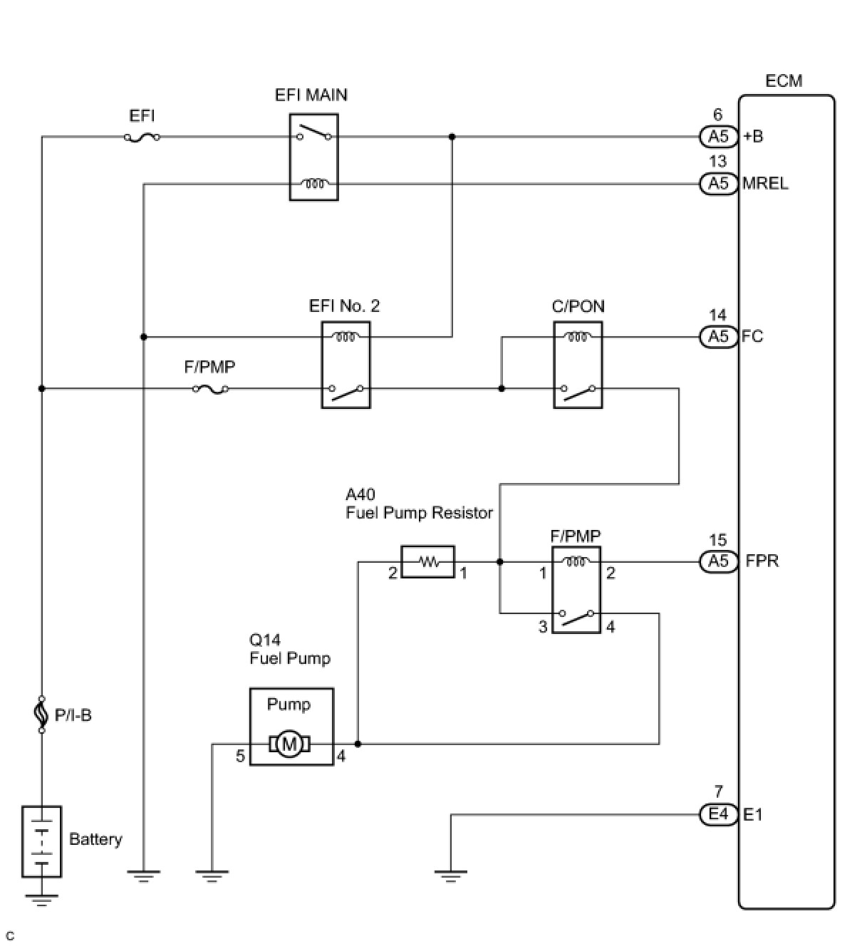 When the engine is cranked, a signal is sent from the ignition control ECU's STSW terminal to the ECM's STSW terminal. Then voltage travels from the ECM's STAR terminal through the park/neutral position switch to the STARTER relay coil. The STAR terminal also sends a signal to the STA terminal. When the STA signal and NE signal are input to the ECM, the ECM interior's Tr1 turns on, which causes power to be supplied to the C/OPN relay coil (C/OPN on). As a result, the F/PMP relay actuates, which causes the fuel pump to operate. If the engine is operating and NE signals are being output, the ECM interior's Tr1 is on (C/OPN on), and the fuel pump will continue operating. The fuel pump's has a high and low speed setting. When the engine is starting or operating with a heavy load, the ECM interior's Tr2 turns on to actuate the F/PMP relay so that the fuel pump operates at the high speed setting. When the engine is idling or operating with a light load, the Tr2 turns off, and current flows through the fuel pump resistor to the fuel pump so that the fuel pump operates at the low speed setting.