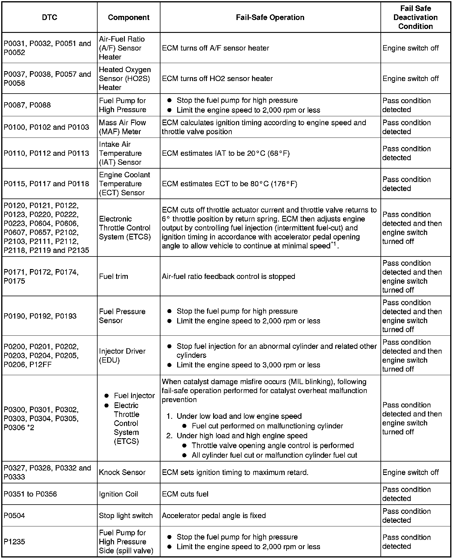 If any of the following DTCs are set, the ECM enters fail-safe mode to allow the vehicle to be driven temporarily.