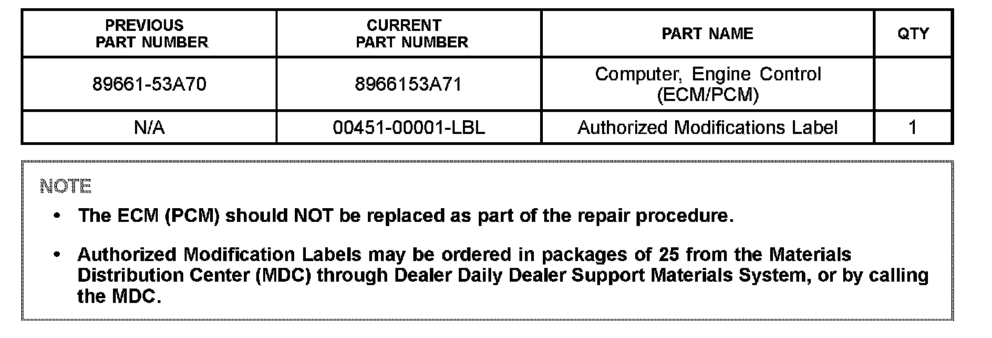 Before proceeding, verify the ECM (PCM) calibration has NOT been updated by checking for the Authorized Modifications Label (shown in step 1 of the Repair Procedure).