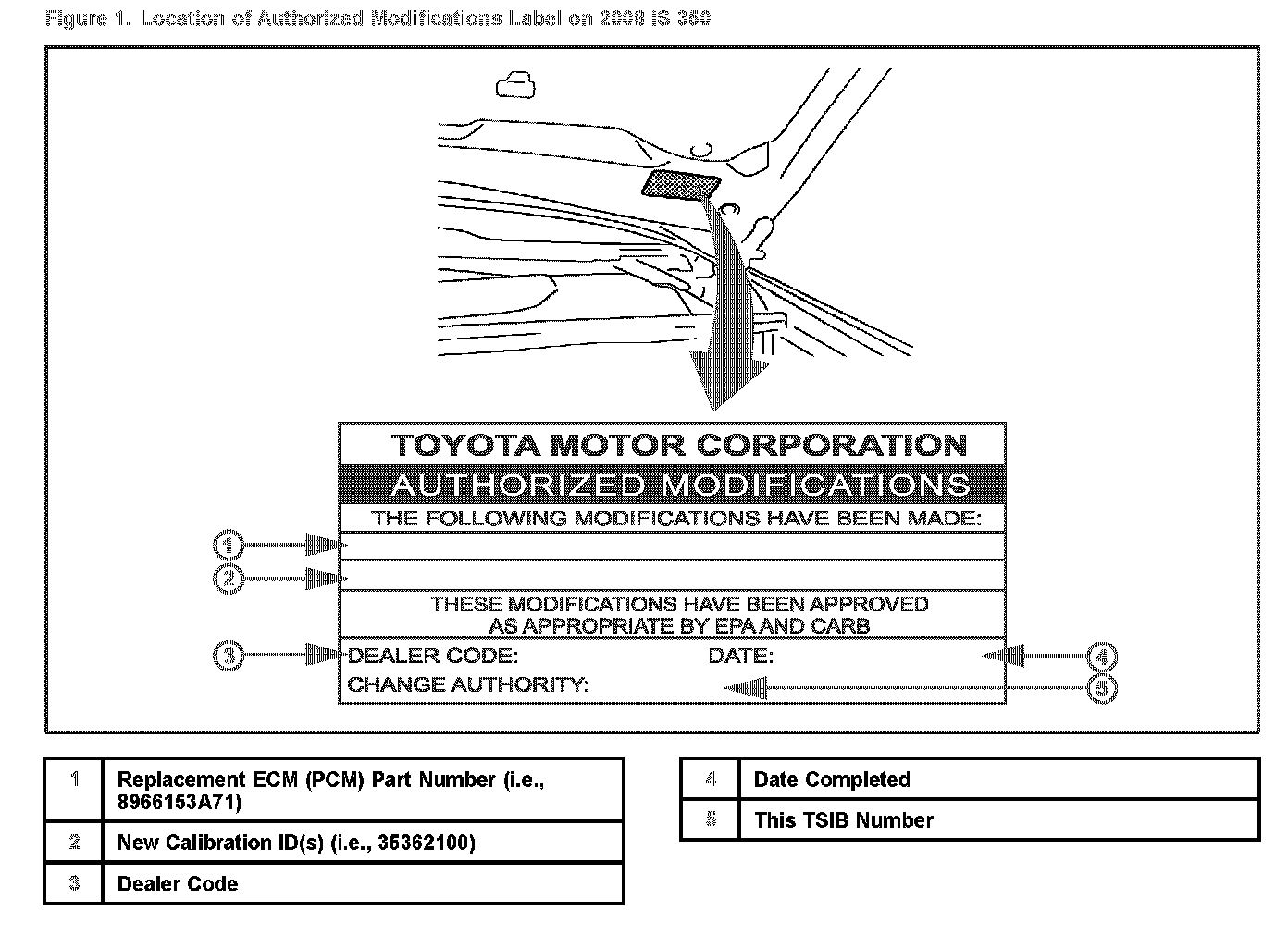 1. Check for the Authorized Modifications Label affixed to the vehicle in the location shown in Figure 1. Confirm if the ECM (PCM) calibration has been updated. If the calibration ID listed is NOT the latest ECM (PCM) calibration go to step 2.