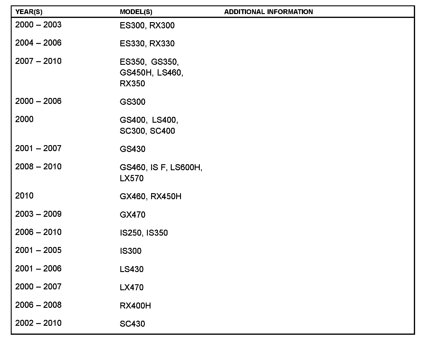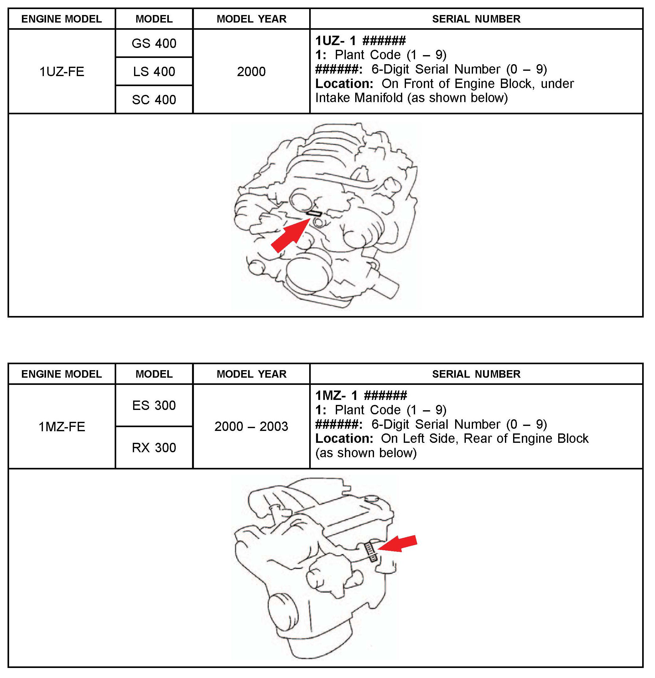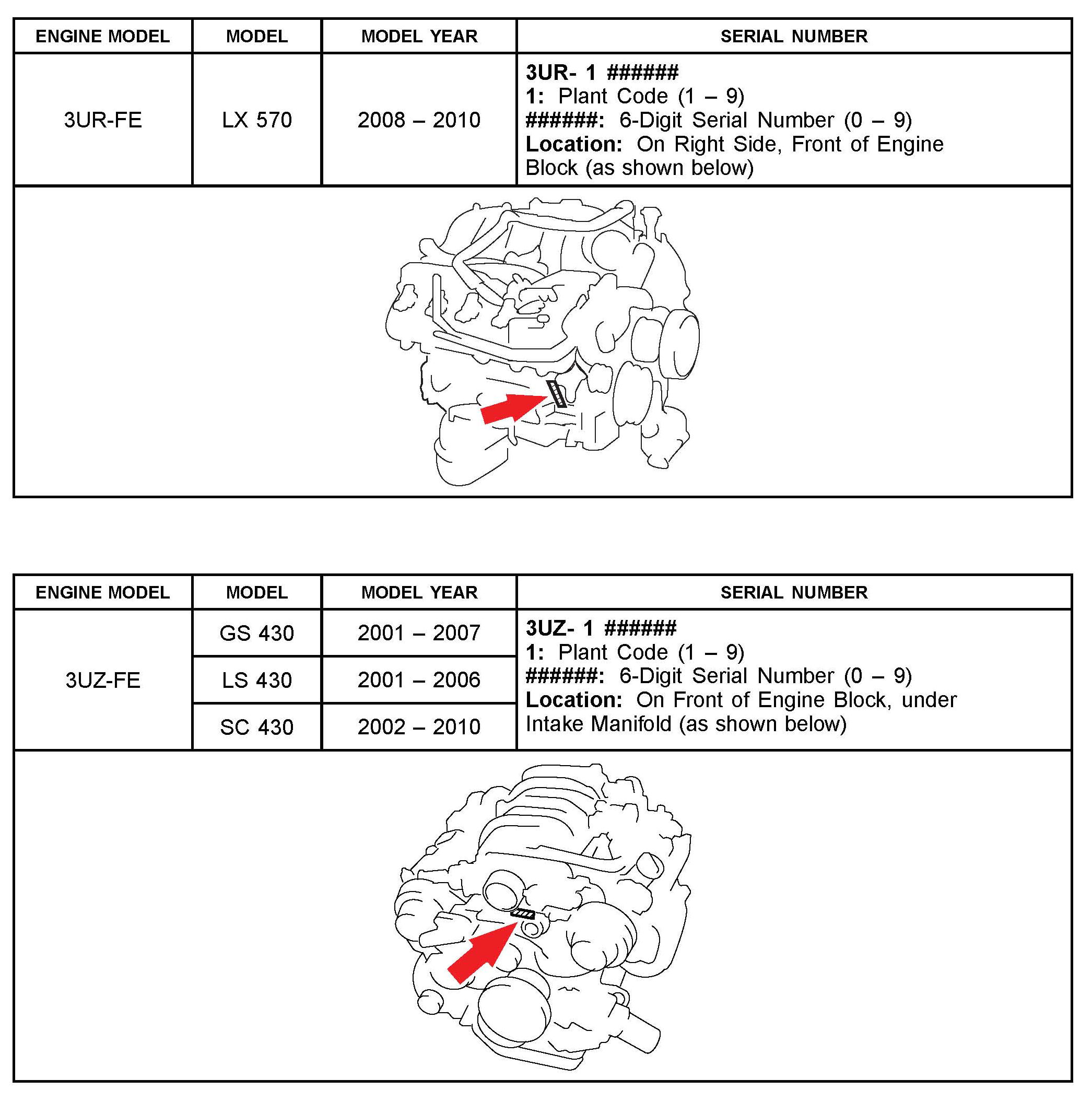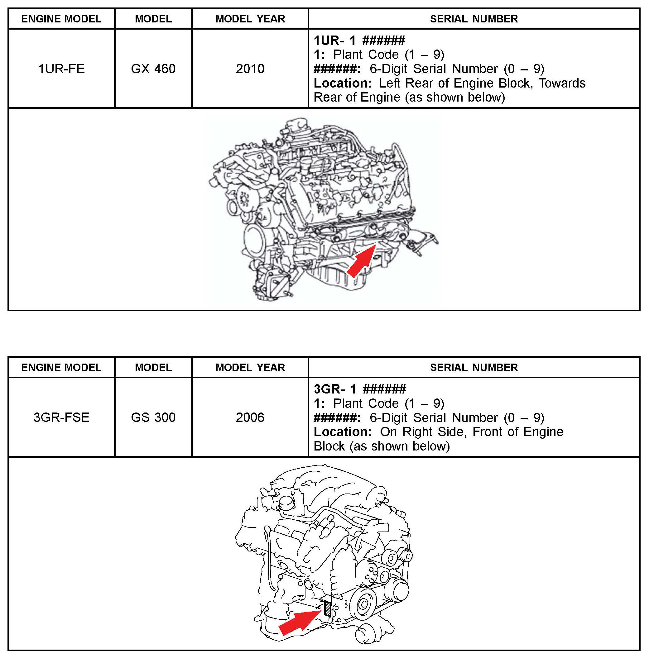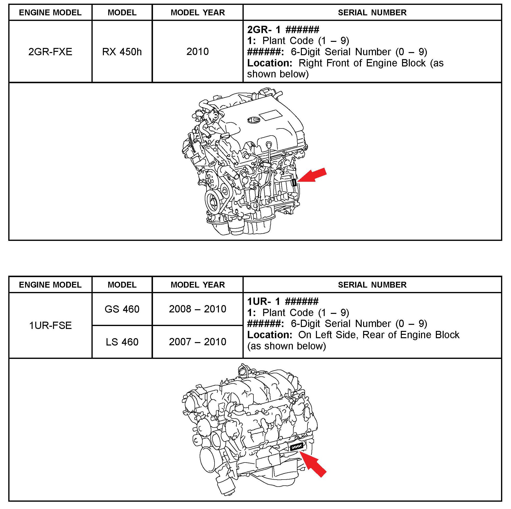 The purpose of this TSIB is to assist in the identification and location of engine serial numbers on 2000 - 2010 model year Lexus vehicles.