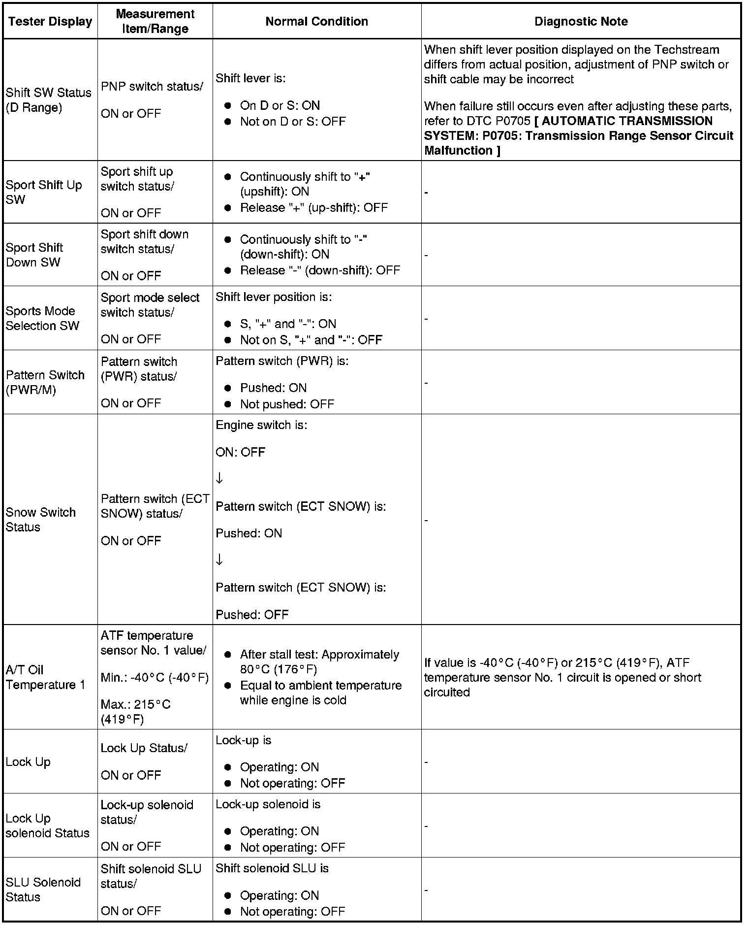 HINT: Using the Techstream to read the Data List allows the values or states of switches, sensors, actuators and other items to be read without removing any parts. This non-intrusive inspection can be very useful because intermittent conditions or signals may be discovered before parts or wiring is disturbed. Reading the Data List information early in troubleshooting is one way to save diagnostic time.