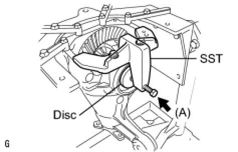 (d) Remove the dial indicator and loosen the bolt (A) until the SST disc is separated from the case bearing outer race.