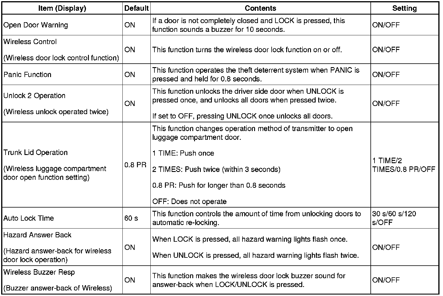 (e) Select the setting by referring to the table below.