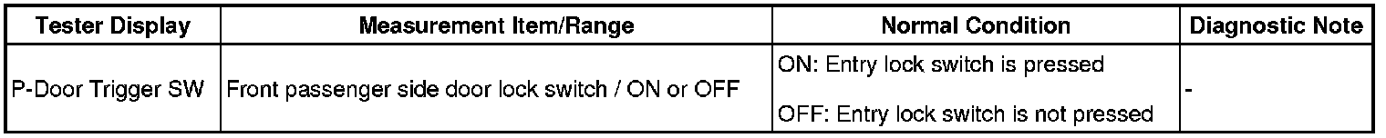 If the front passenger side door entry lock function does not operate but the entry unlock function operates, the communication line between the vehicle and electrical key transmitter is normal. Any of the following components may have a malfunction: 1) touch sensor circuit certification ECU (smart key ECU assembly); 2) front door outside handle assembly (front passenger side); or 3) door electrical key oscillator (front passenger side).
