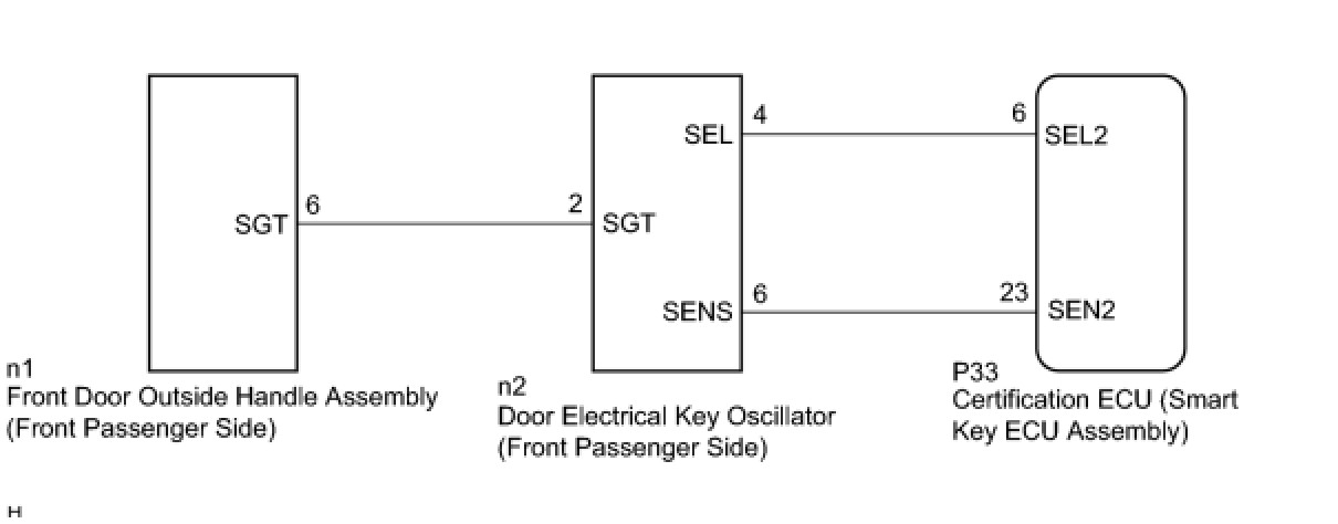 If the front passenger door entry unlock function does not operate but the entry lock function operates, the communication line between the vehicle and electrical key transmitter is normal. Any of the following components may have a malfunction: 1) touch sensor circuit certification ECU (smart key ECU assembly); 2) front door outside handle assembly (front passenger side); or 3) door electrical key oscillator (front passenger side).